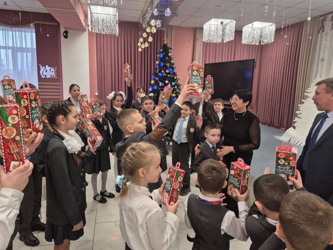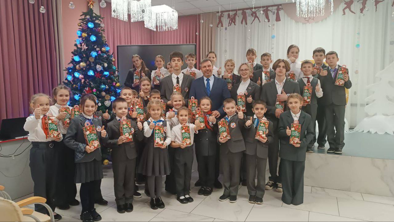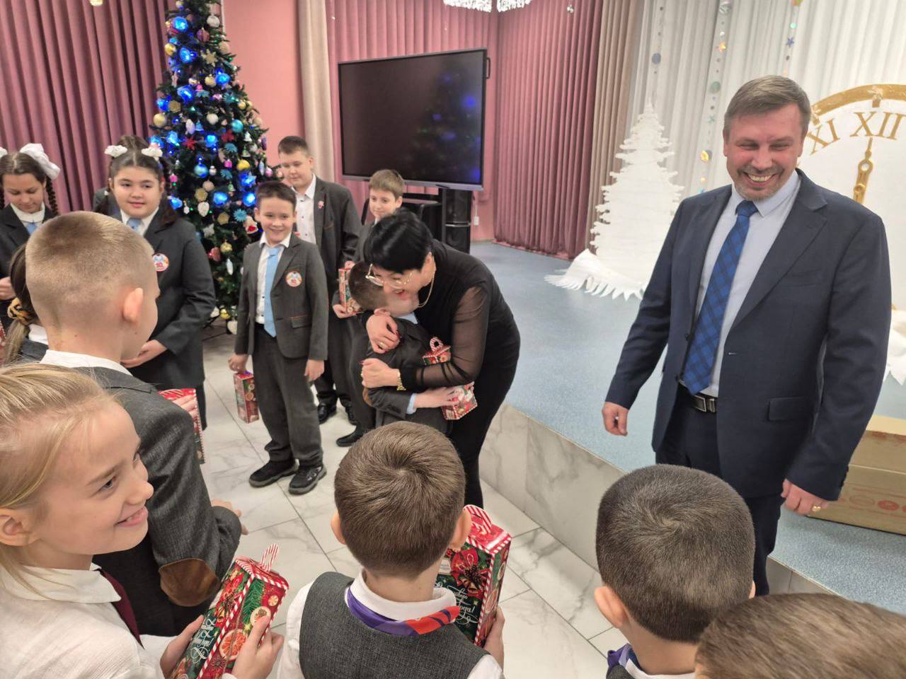 Оксана Тумко, председатель Батайской городской Думы, и Александр Симоненко, директор лицея № 10, в тёплой дружеской обстановке вручили новогодние подарки детям участников специальной военной операции.