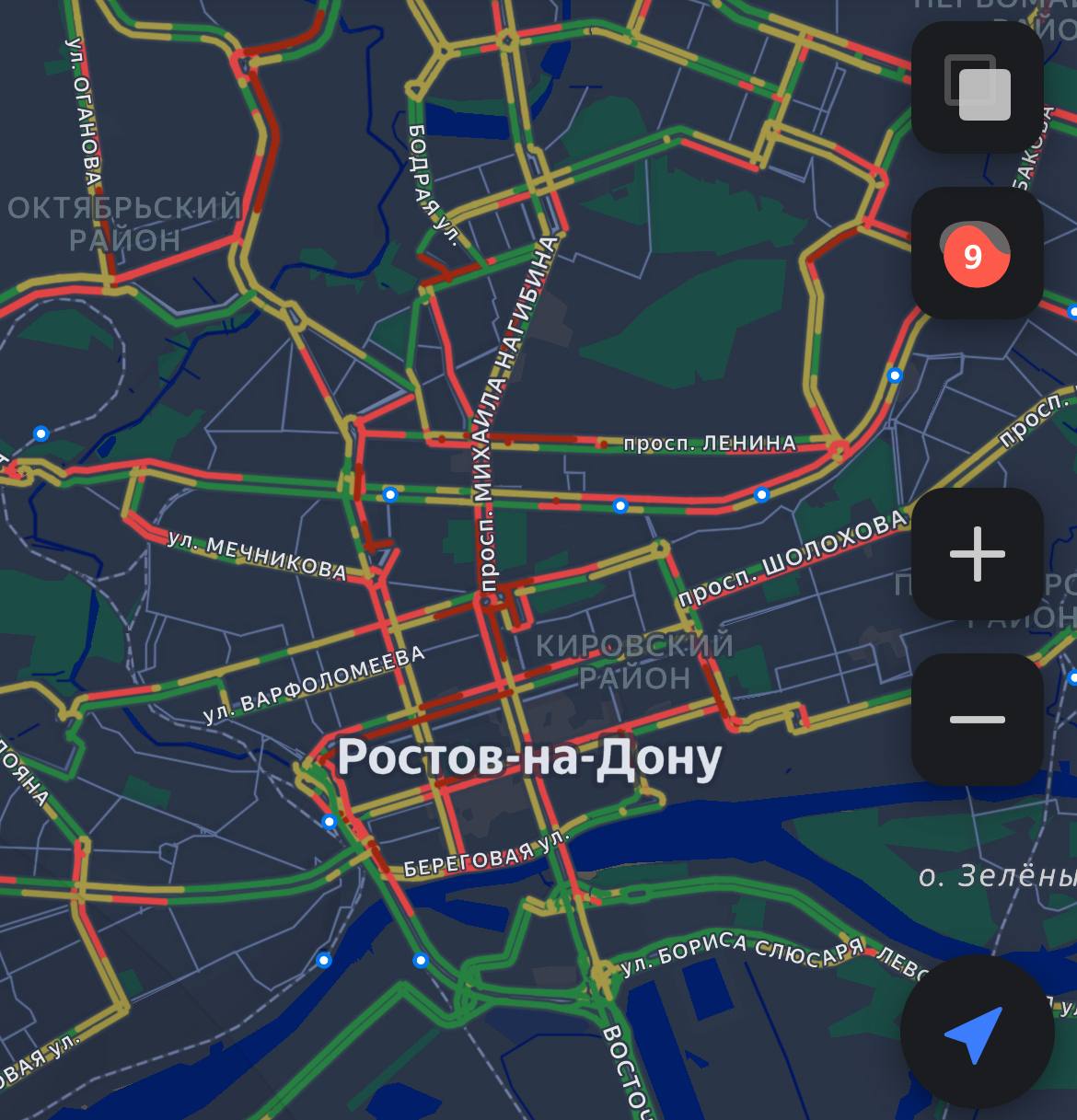 Основные магистрали, включая улицы Большая Садовая, Красноармейская и Максима Горького, практически на всем протяжении окрашены в бордовый цвет — показатель критических пробок. Тяжелая ситуация сложилась на проспектах Ворошиловском, Михаила Нагибина, Стачки и Шолохова. На Нагибина длина заторов в обе стороны достигает километра.