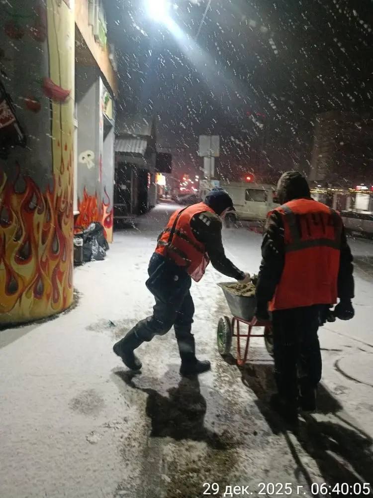 Подрядная организация продолжает противогололёдную обработку дорог и тротуаров песчано-соляной смесью, чтобы снизить риск скольжения на улицах города. Работы выполняются как механизированным, так и ручным способом.
