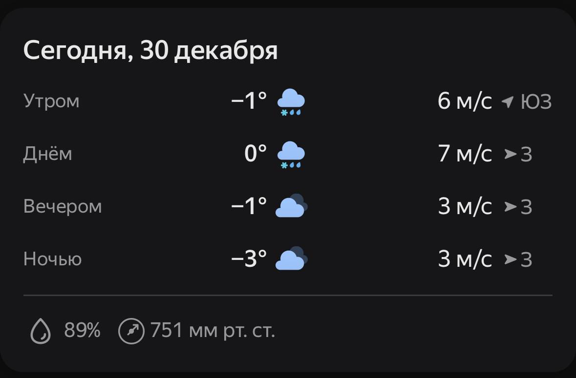 Во вторник, 30 декабря, прогнозируются небольшие осадки в виде мокрого и обычного снега. На дорогах возможна гололедица. Ветер ожидается юго-западный и западный со скоростью 7 — 12 метров в секунду. Ночью столбики термометров опустятся до -3… -5...
