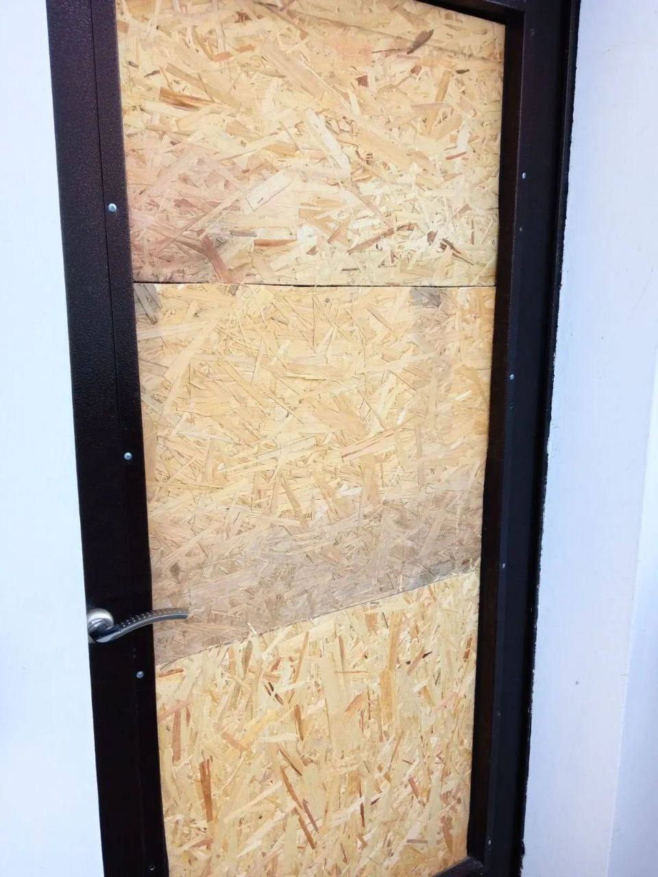 Инцидент произошел в доме №15 на улице Андреева. Стекло в двери выбито, сейчас проем закрыт фанерой.