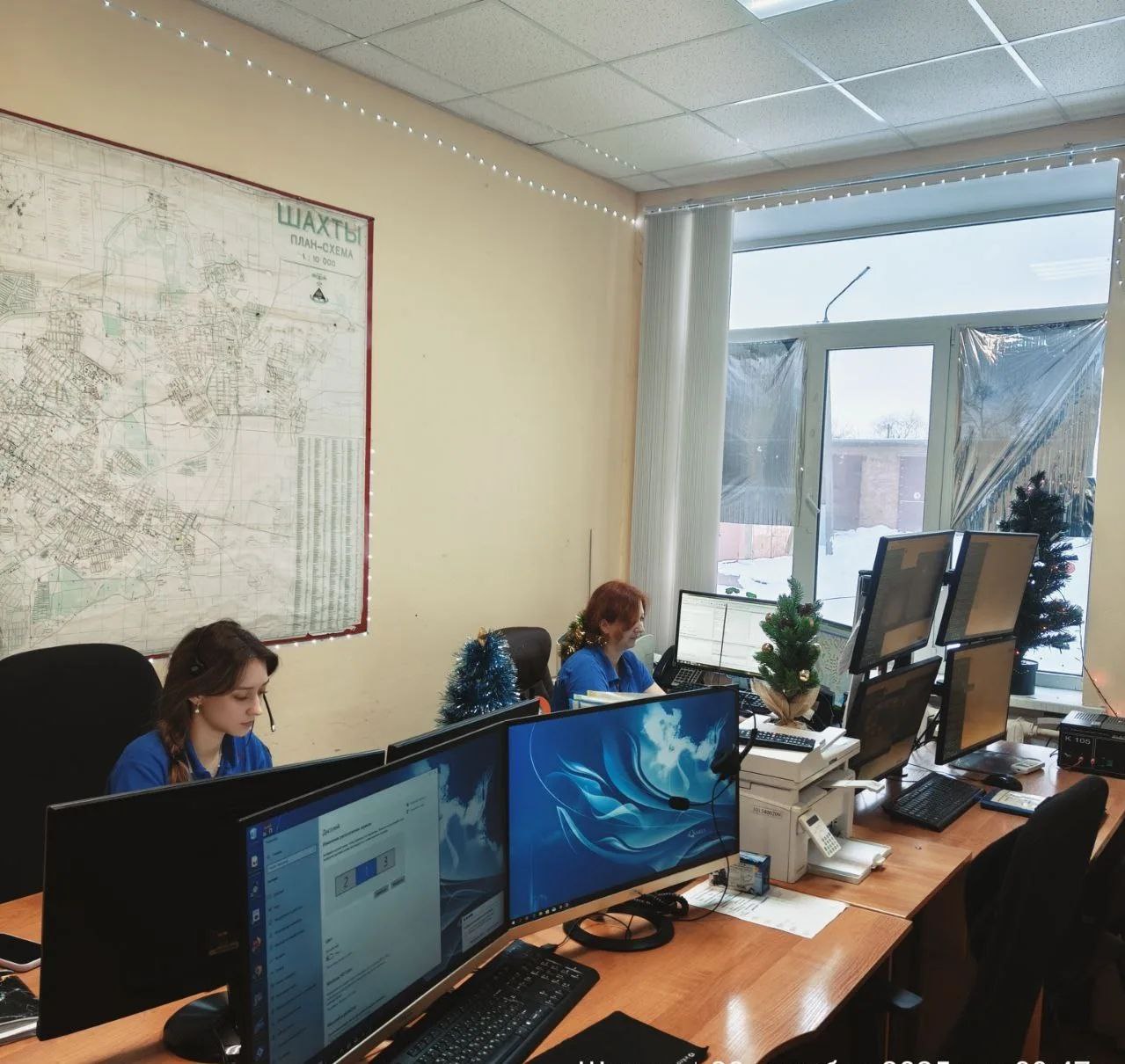 В дежурных сменах Службы 112 города Шахты новогоднее настроение помогают создавать праздничные украшения оперативного зала, а вот стол с угощениями отсутствует. В приоритете - ответственная служба.