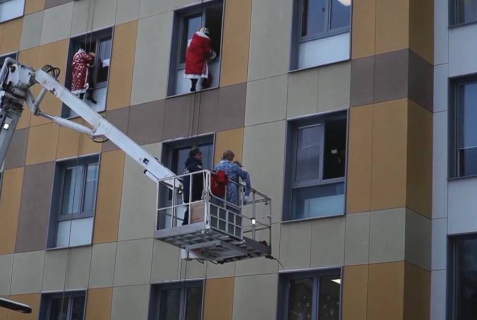 Добровольцы в костюмах главных новогодних волшебников устроили самый эффектный вход — они спустились с подарками прямиком с крыши! А Снегурочка поздравила ребят, поднявшись к окнам на настоящем пожарном подъёмнике.