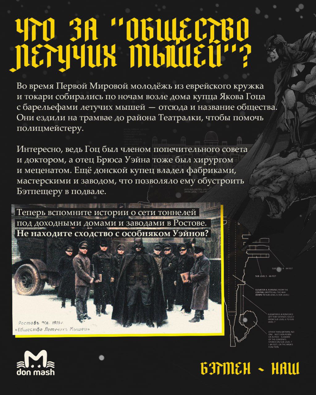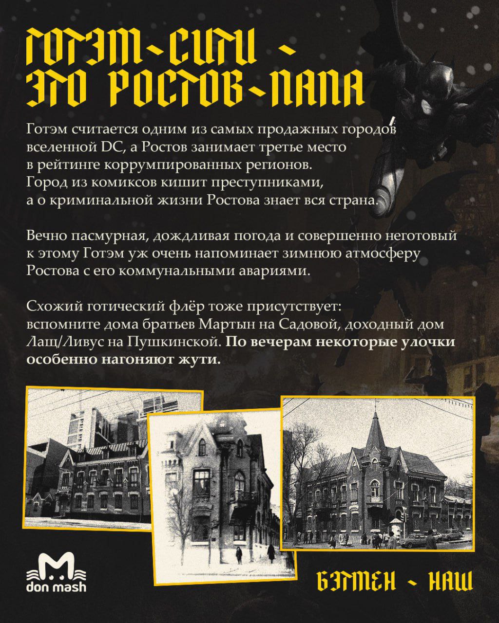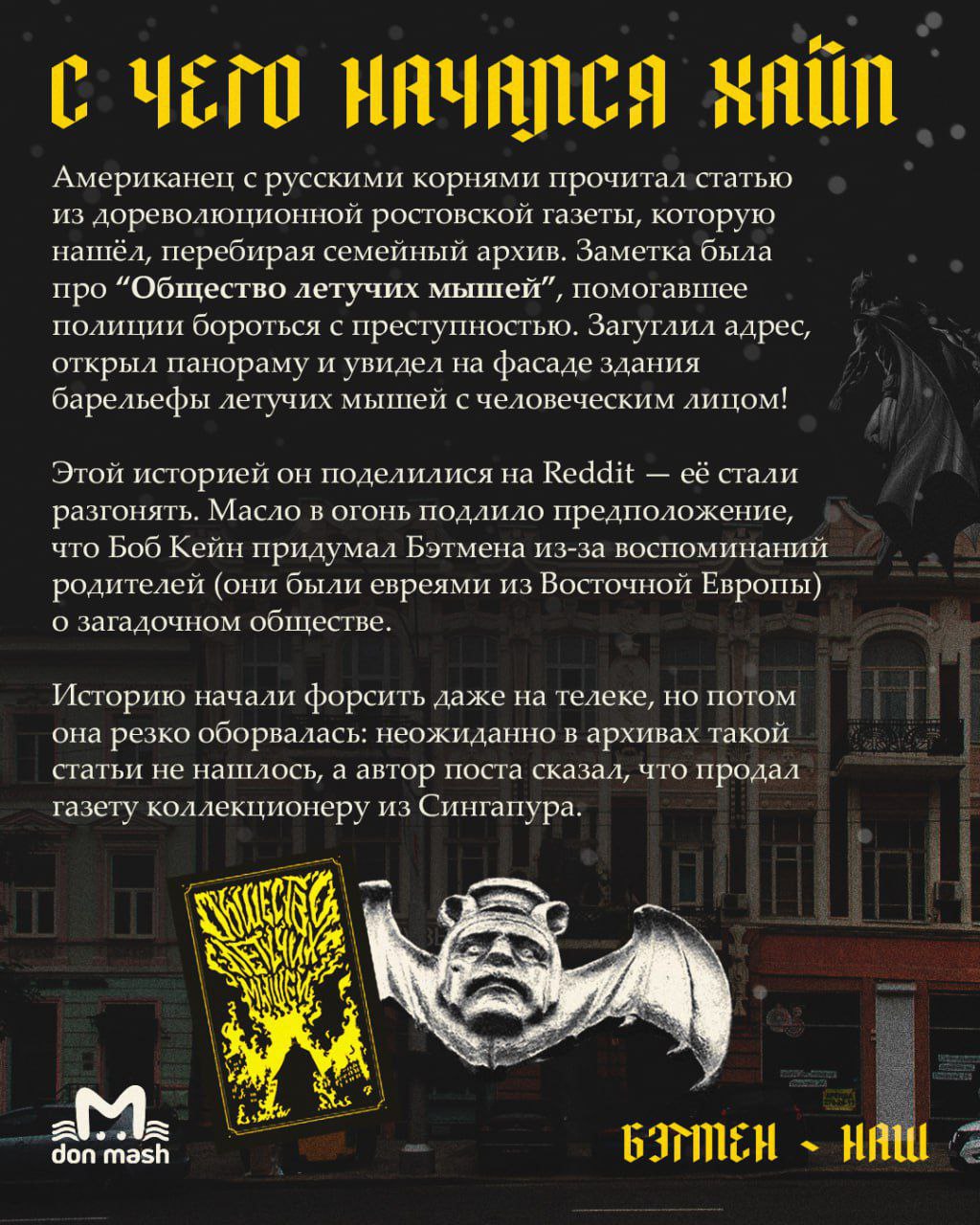 Мы копнули глубже и нашли совпадения, говорящие о том, что Бэтмен на самом деле ростовчанин. Оказалось, Готэм-сити списан с Ростова-папы, а отец и особняк Брюса Уэйна — с купца Якова Гоца и его дома. Разбор злодеев предлагаем вам, подписчики, устроить в комментариях.