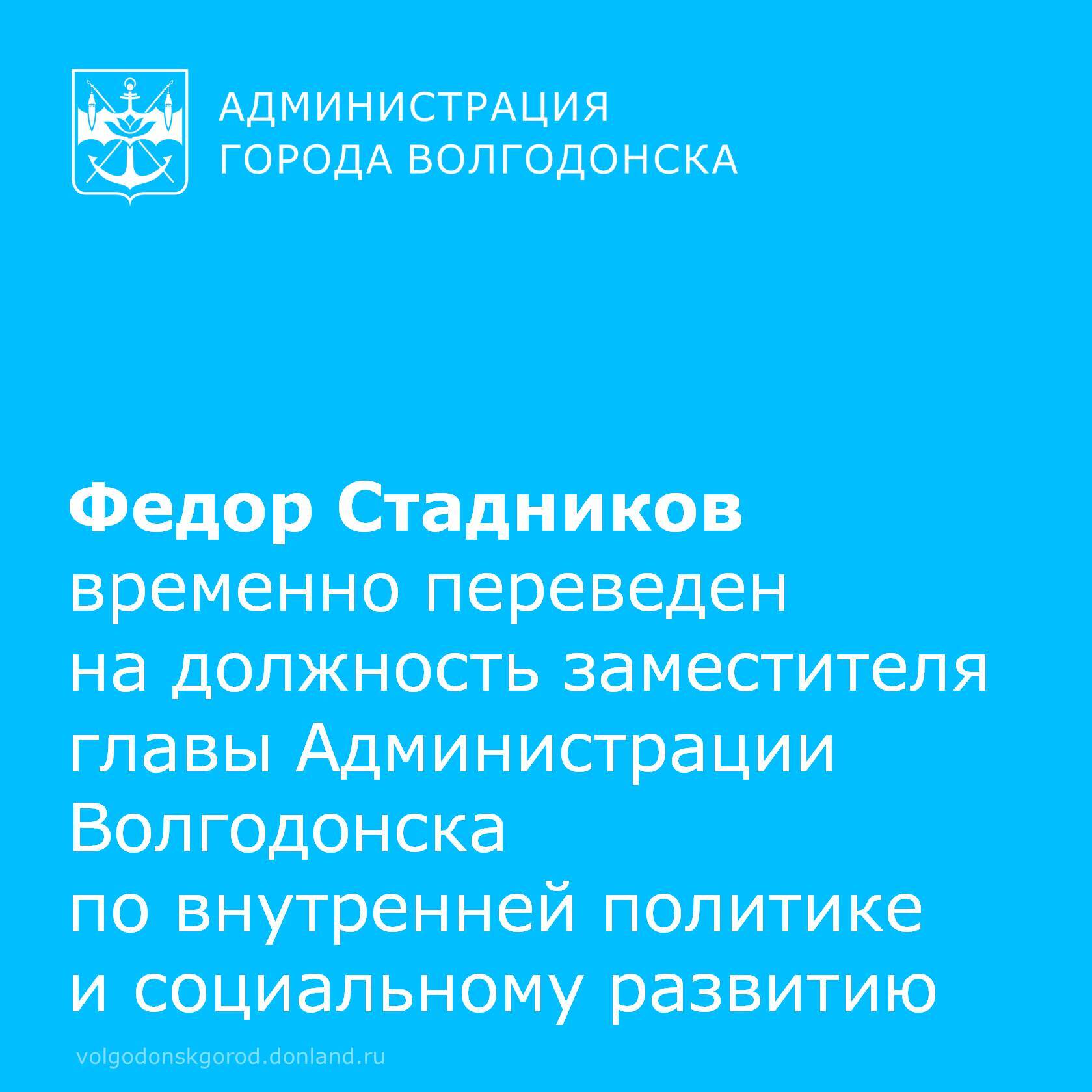12 января Глава города Дмитрий Вельможко на аппаратном совещании представил кадровое решение. Временно на должность заместителя главы Администрации Волгодонска по внутренней политике и социальному развитию переведен Федор Стадников.
