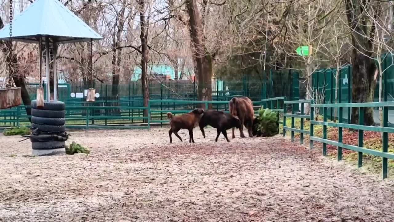 А вот семью зубров пушистые ветки удивили — они приняли деревья за игрушки.