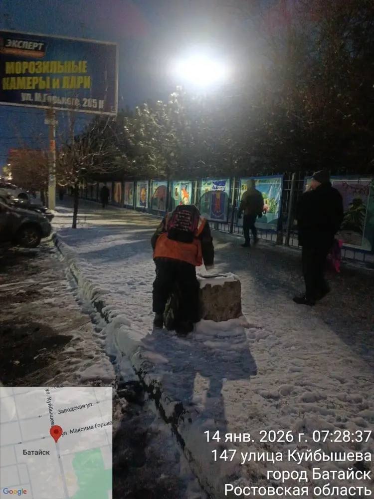 Минувшей ночью подрядная организация продолжила дежурство на улицах Батайска: техника очищала проезжую часть и обрабатывала дороги песчано-соляной смесью, чтобы снизить риск гололёда и сделать дороги и тротуары безопаснее.