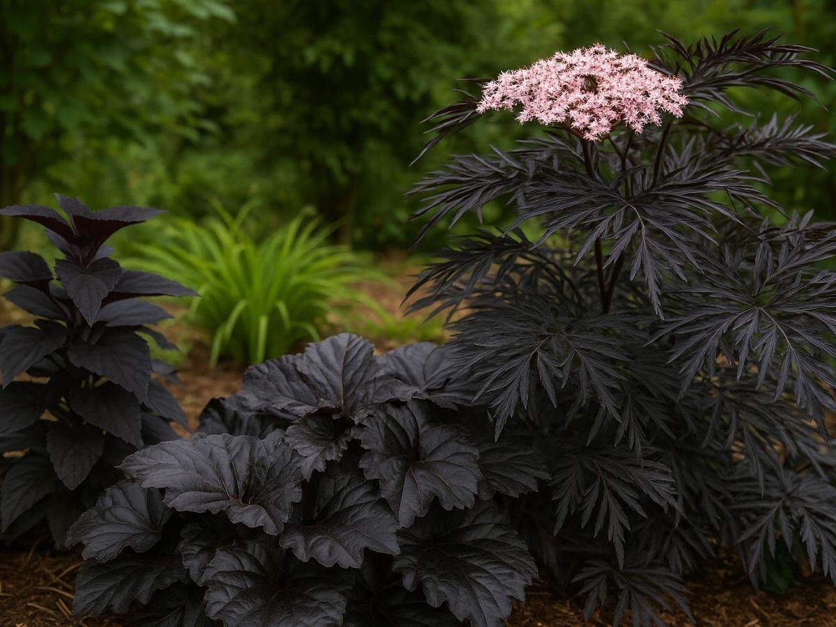 Бузина черная, известная своими темными ягодами, также имеет сорта с привлекательной листвой, такие как Black Lace и Black Beauty. Эти растения предпочитают солнечные места, поскольку в тени листья светлеют. К тому же бузина является ценным медоносом и традиционно используется в народной медицине.
