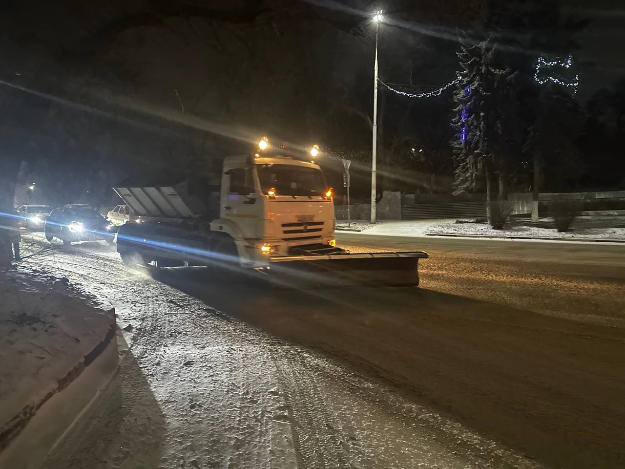 Минувшей ночью коммунальные службы занимались расчисткой городских улиц. Работы не прекращались на протяжении всей ночи и продолжаются в настоящий момент. На дорогах работает 8 единиц специализированной техники.