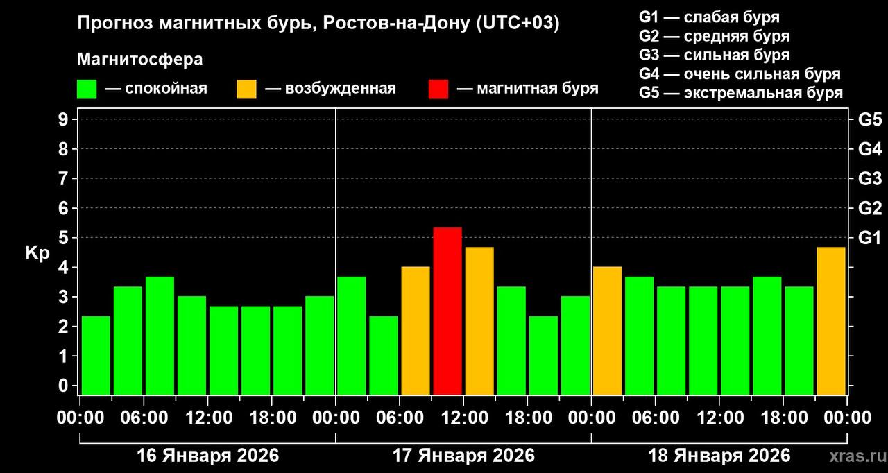 17 января на регион обрушится магнитная буря уровня G1 с Кр-индексом выше 5. Начнутся возмущения примерно в 6 утра и продлятся они до полудня, а потом пойдут на спад. С 18 часов магнитный фон должен полностью стабилизироваться.