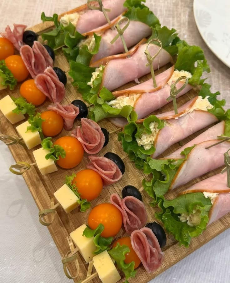 - Рулетики из ветчины с нежным сыром: ветчина, плавленый или творожный сыр, — удобный вариант для быстрого импровизированного фуршета. Смешать сыр с чесноком, намазать на ломтики ветчины, свернуть и нарезать.
