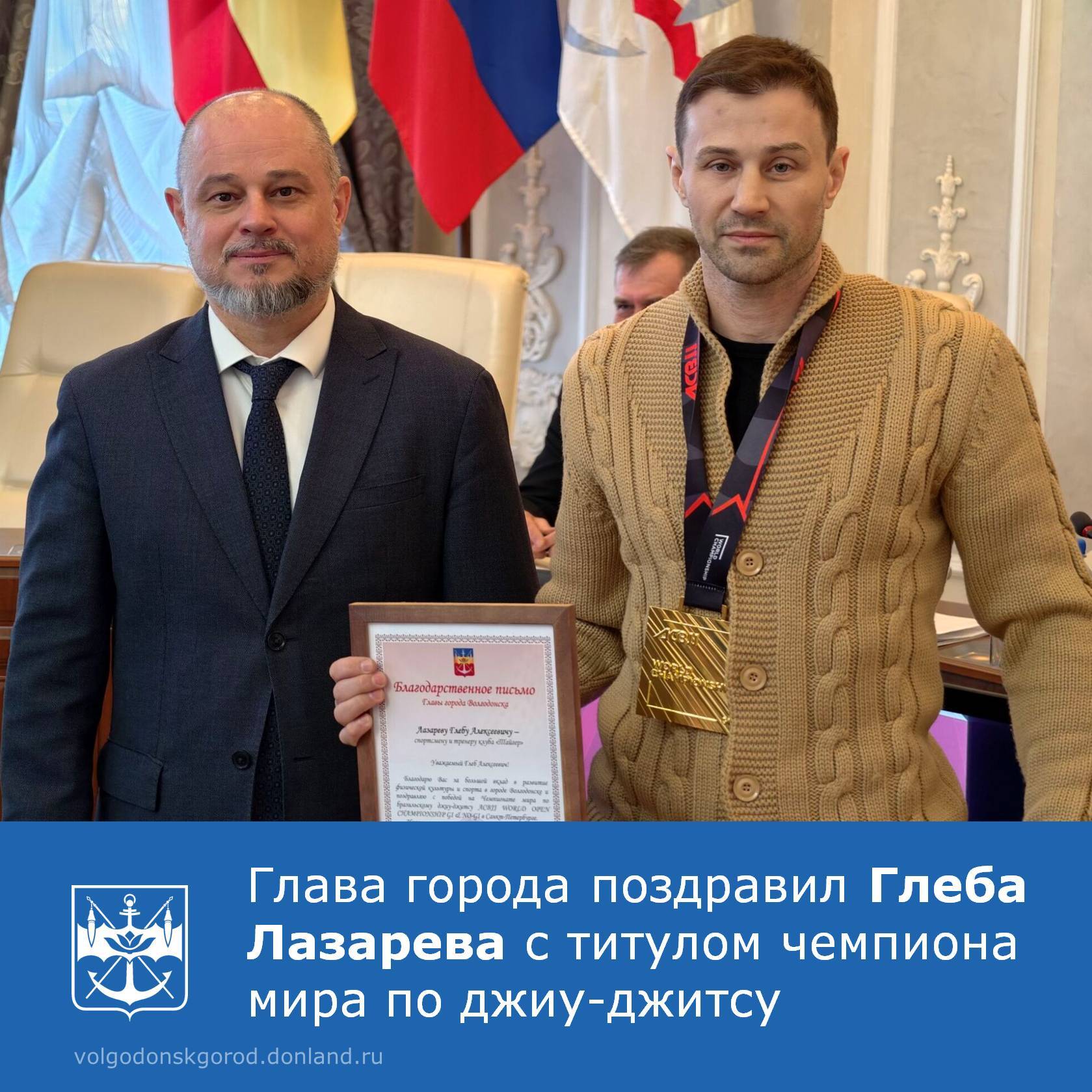 Глава Волгодонска Дмитрий Вельможко встретился с чемпионом мира, мастером спорта Глебом Лазаревым. Руководитель города поздравил спортсмена с победой на чемпионате мира по бразильскому джиу-джитсу в Санкт-Петербурге, где в борьбе с 6300 атлетами он завоевал золотую медаль.