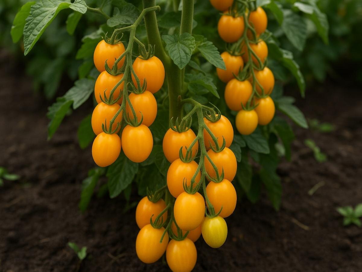 Плоды формируются группами по 10-14 штук, каждый из которых весит 80-90 граммов, обладая плотной кожицей и насыщенным янтарным оттенком. Одна из главных сильных сторон сорта – высокая урожайность, достигающая до 5 кг томатов с куста. Плотная структура плодов делает их идеальными для консервирования и маринования.