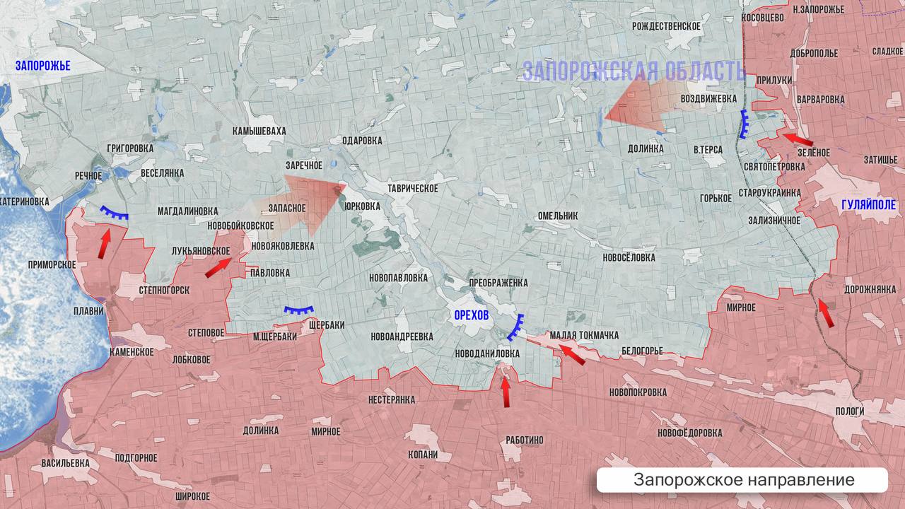 На Запорожском фронте идут бои в районе Лукьяновского, за Новобойковское, Новояковлевку и Павловку. ВС РФ широким фронтом продвигаются на северо-востоке от Степового во фланг Орехову. Наши войска установили контроль над рядом позиций на западе от Нестерянки, а также в Новоданиловке. Южнее Малой Токмачки ВСУ смогли восстановить контроль над руинами тюрьмы, ранее находившимися в серой зоне.