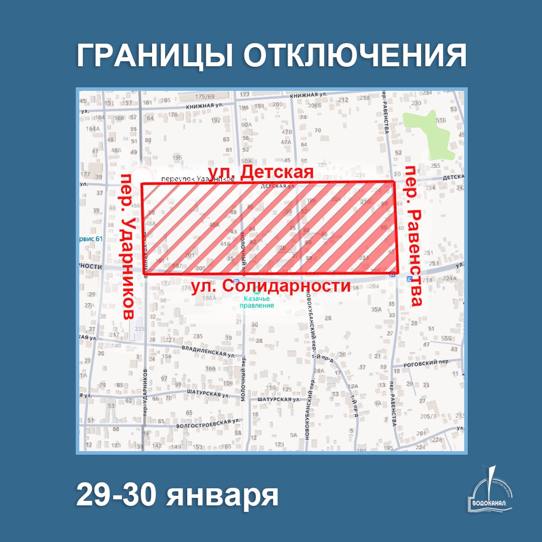Ресурс отключат с 8:00 29 января до 8:00 30 января в границах переулка Ударников — улицы Детской — улицы Равенства — улицы Солидарности. Об этом сообщили в Ростовводоканале.