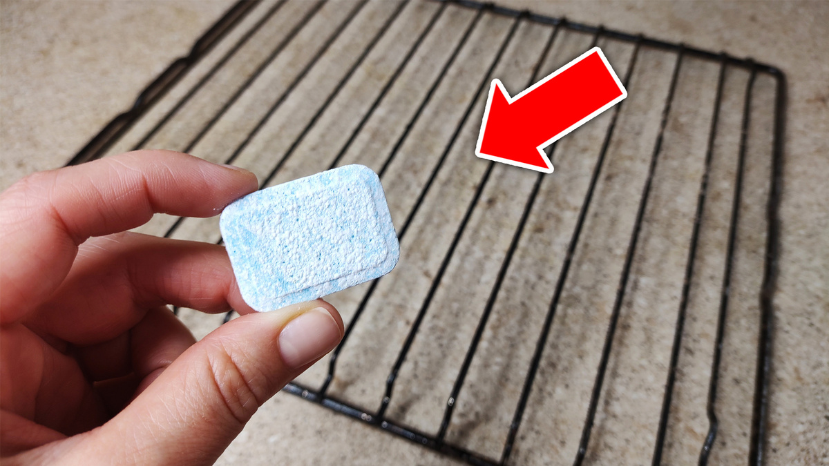 Зачем тратить силы на сложные методы, если под рукой есть обычная вода и таблетка для посудомоечной машины? Налейте полный противень водой и доведите до кипения под духовкой. Затем растворите таблетку в кипящей воде — измельчать её можно заранее для ускорения реакции.