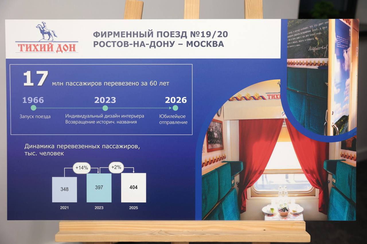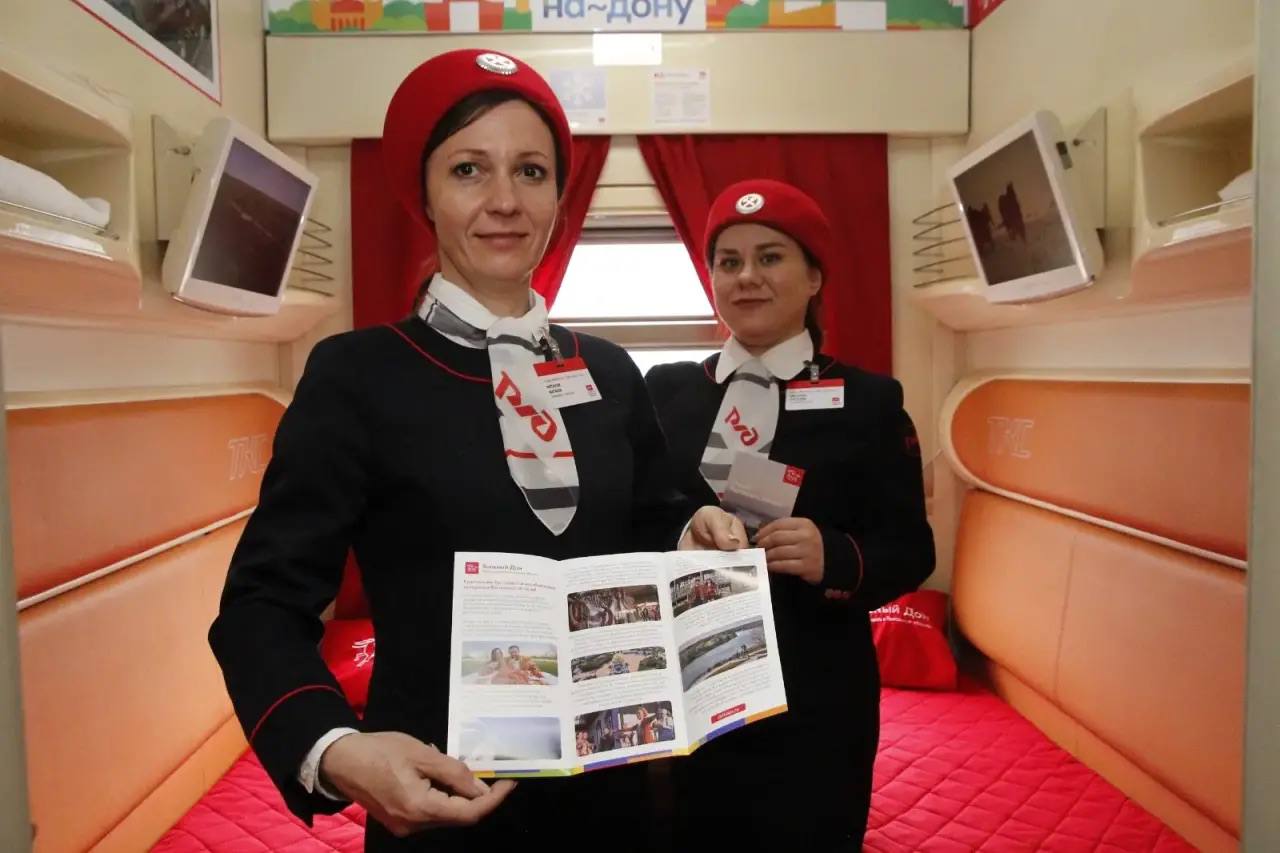 К примеру, свое название поезд получил в память о произведении М.А. Шолохова. Но в 2009 году был переименован в Премиум, под которым он курсировал до сентября 2023 года. После чего по просьбам пассажиров поезду вернули историческое имя. А внутри появились вагоны оформленные в стиле туристского бренда Ростовской области и информационные буклеты о регионе. Тогда совместно с начальником Северо-Кавказского филиала ознакомился с выполненным брендированием.