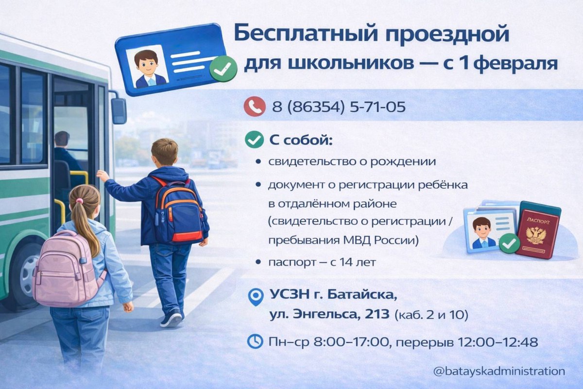 В феврале УСЗН г. Батайска приглашает школьников, обучающихся в общеобразовательных организациях города и имеющих регистрацию по месту жительства в отдалённых районах Батайска, для получения бесплатного проездного талона.