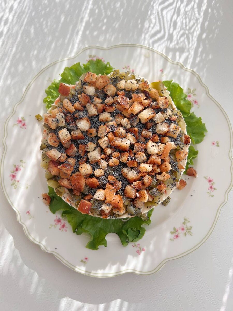 Предложенная версия удачная альтернатива классике: сочетание маринованных грибов и сильного овощного акцента делает салат более плотным и насыщенным, а мак добавляет визуальную и вкусовую изюминку. Остаётся пространство для экспериментов: одни повара предпочтут копчёную курицу и свежие помидоры, другие тёплую авторскую сборку с сухариками и зажаркой.