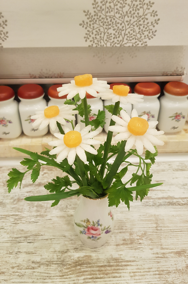 Теперь можно поместить эти волшебные цветы в вазу с водой вместе с листьями зелёного лука и веточками петрушки. Чтобы сделать серединки наших ромашек, вырезаем конусы из сердцевины яблок и нарезаем их на кружочки.