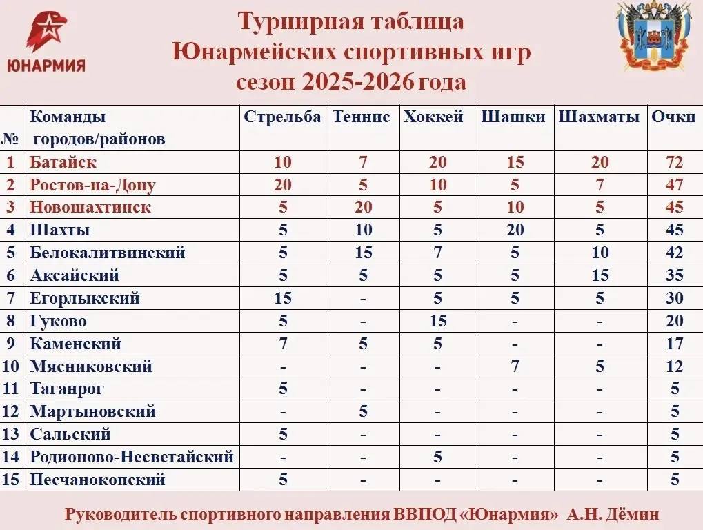Батайские юнармейцы уверенно держат 1-е место в турнирной таблице IV региональных юнармейских спортивных игр сезона 2025-2026 годов. По сумме уже прошедших дисциплин — стрельба, настольный теннис, хоккей, шашки и шахматы — наша команда набрала 72 очка, опередив всех соперников из городов и районов Ростовской области.