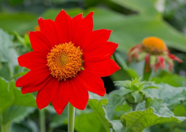 Высота титонии варьируется от 1,2 до 1,8 метра, но может превышать и эти значения. У нее мощный, ветвящийся стебель, который нуждается в поддержке. Листья темно-зеленые, длиной от 7 до 30 см, они могут быть как цельными, так и лопастными. Цветение титонии начинается в июле и продолжается до первых заморозков, и растения радуют глаз яркими цветками диаметром около 7,5 см с красно-оранжевыми или желтыми лепестками, похожими на ромашки. Эти цветы привлекают пчел и бабочек, что делает титонию привлекательной для опылителей.