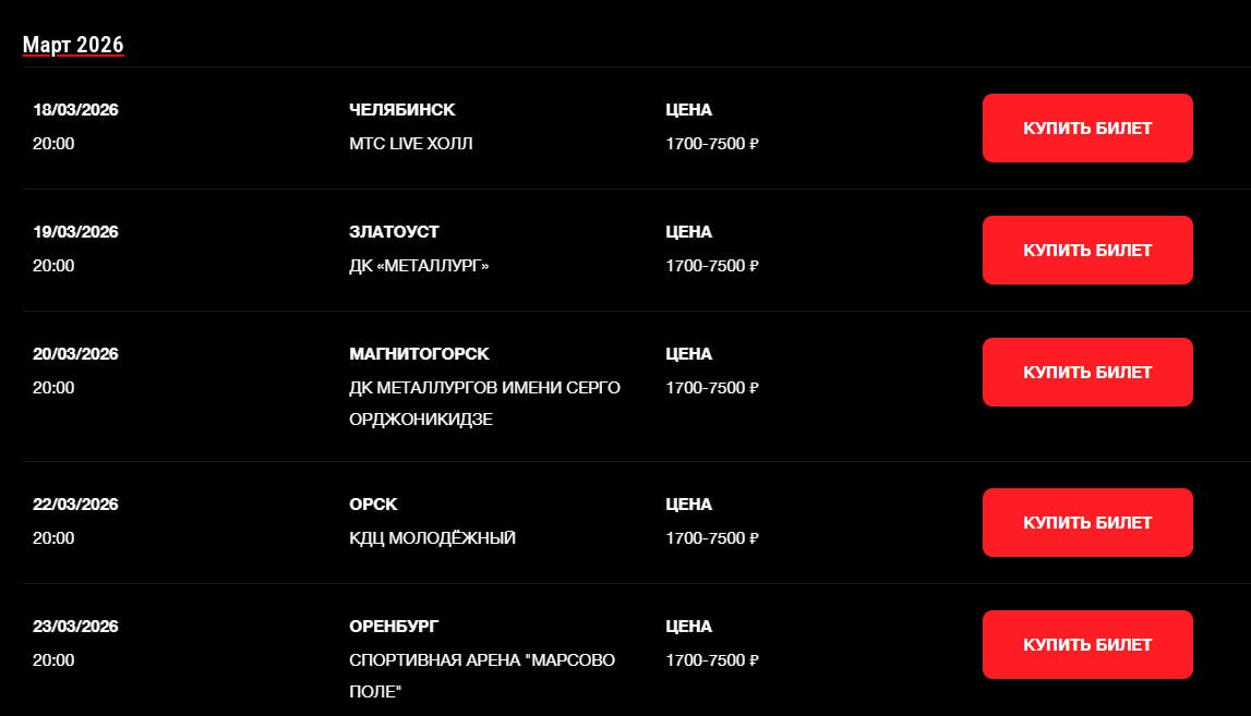 При этом, билеты на ближайшие мартовские концерты все еще можно приобрести. Их стоимость стартует с 1700 рублей — самые дорогие билеты на Stand-Up стоят 7400 рублей.