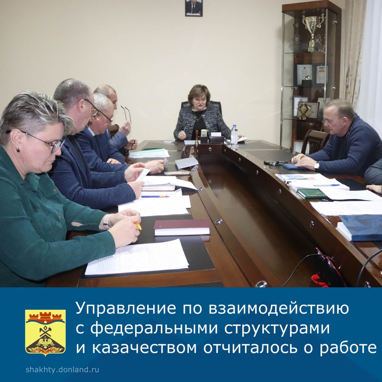 Начальник Управления по взаимодействию с федеральными структурами и казачеством Андрей Спатарь представил главе города Шахты Людмиле Овчиевой отчёт о работе подразделения за прошедший год.