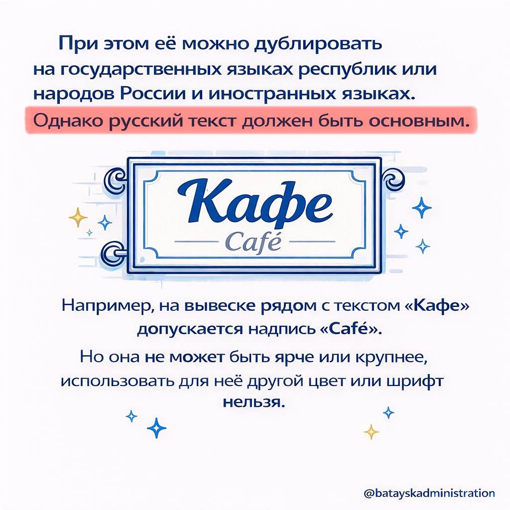 При этом её можно дублировать на государственных языках республик или народов России и иностранных языках. Однако русский текст должен быть основным.
