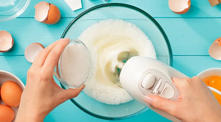 - Французская меренга — простейшая в приготовлении, для которой белки взбиваются с сахаром до получения пышной массы.