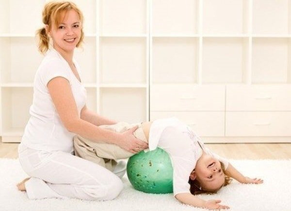 - «Напряженное выгибание». Сядьте на стул, положите малыша на колени, а затем дайте ему задание — коснуться пола и приподняться. Это поможет развить мышцы спины.