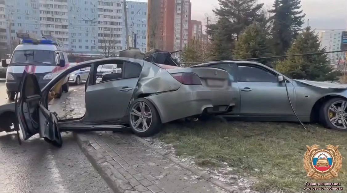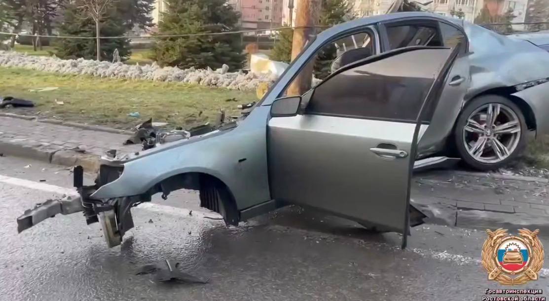 Машину разорвало пополам во время ДТП сегодня утром на Северном. Кадры опубликовали в донской полиции.