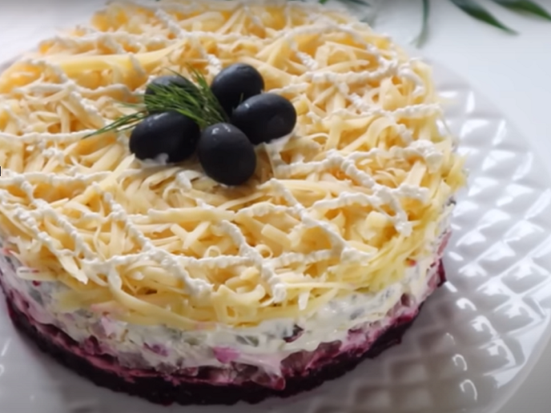 5. Для окончательной отделки нанести сеточку из майонеза, украсив оливками или маслинами и свежей зеленью. Поставить салат в холодильник на час, чтобы он пропитался, после чего аккуратно убрать кольцо и подать к столу.