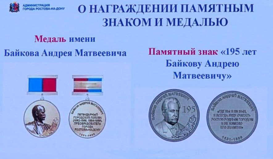 И две новых награды депутаты учредили в связи с объявлением в Ростове Года Андрея Байкова. Это Памятный знак «195 лет Байкову А.М.» и «Медаль им. Байкова А.М.».