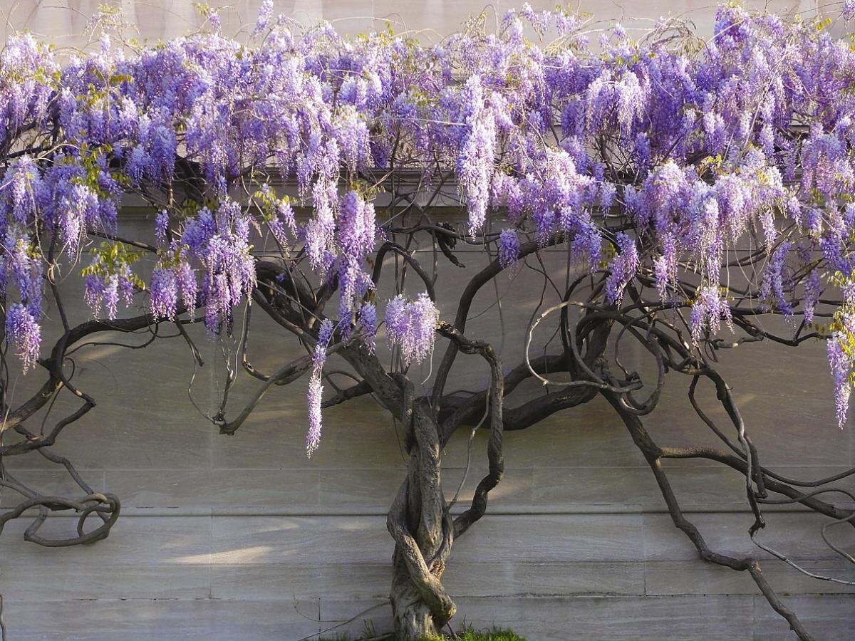Для того чтобы глициния не росла в хаотичном порядке, ее необходимо обрезать дважды в год. После цветения нужно укоротить боковые побеги до 30-50 см, а в конце зимы — оставить лишь 2-3 почки. Это не только способствует цветению, но и помогает растению не загораживать свет соседним растениям.