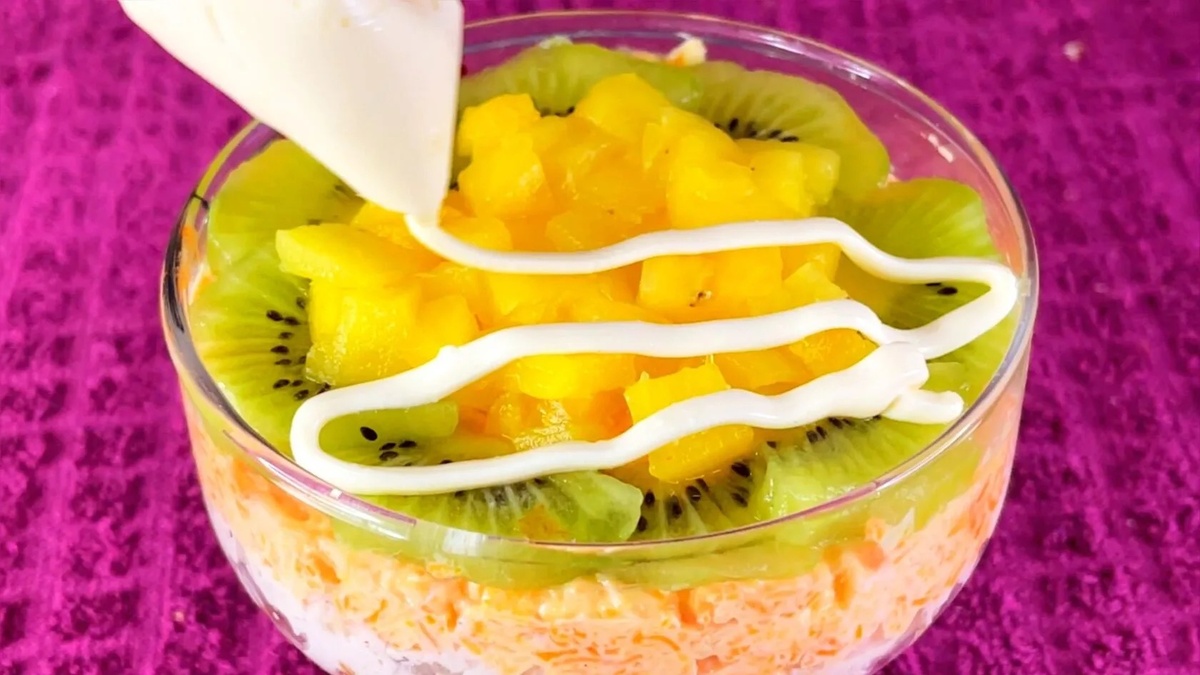 Заправка: 1–2 столовые ложки майонеза или сметано-майонезного соуса. Для украшения подойдут любые фрукты; киви — отличный вариант.