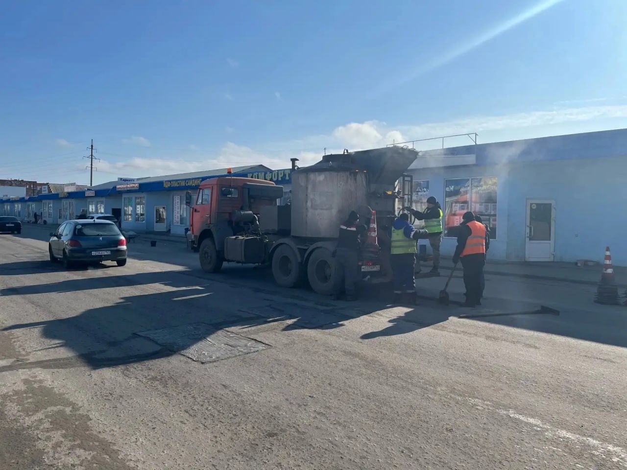В рамках содержания автомобильных дорог с твёрдым типом покрытия, подрядной организацией производятся работы по устройству литой горячей асфальтобетонной смеси на ранее подготовленных участках.