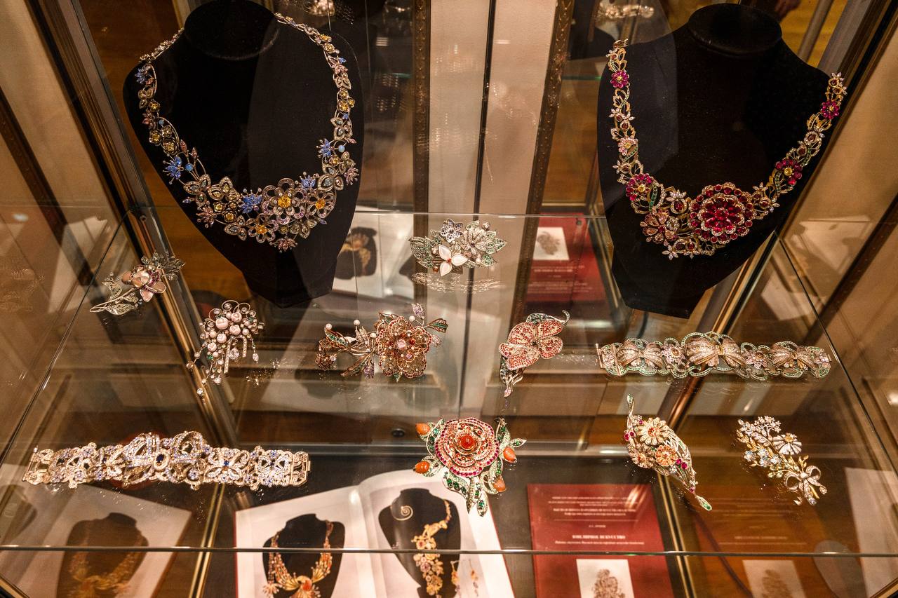 На выставке представлены уникальные произведения, выполненные студентами Российского университета традиционных художественных промыслов по следующим направлениям: уникальная ростовская финифть, нижнетагильская роспись, миниатюра, хохлома, ювелирное искусство и богородская резьба по дереву.