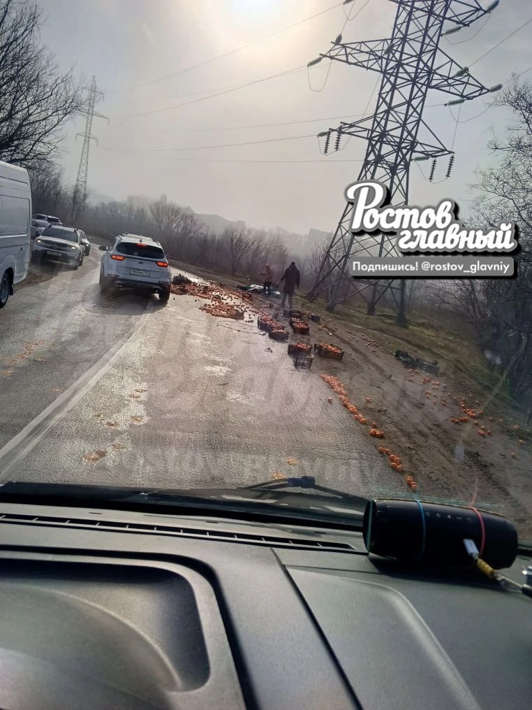 Апельсиновое ДТП произошло на улице Совхозной в Ростове. У водителя пикапа из кузова выпали ящики с цитрусами, из-за чего фрукты рассыпались по проезжей части и затруднили движение.