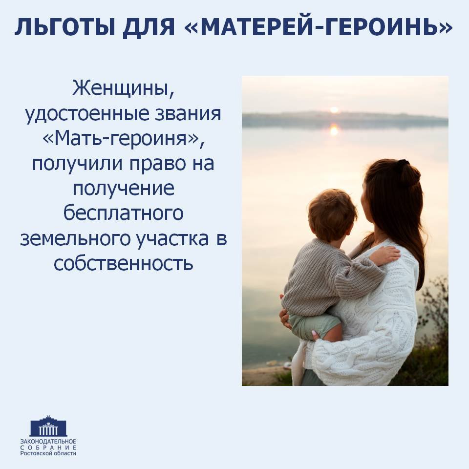 В чем отличие этой нормы от получения земельных участков многодетными семьями? Если многодетные семьи должны состоять на учете в качестве нуждающихся в улучшении жилищных условий, то в отношении тех женщин, которые получили высокое звание «Мать-героиня», это не требуется. Они могут получить земельный участок без такого условия. При этом в законодательстве предусмотрены и иные меры социальной поддержки этой категории граждан, – пояснил Председатель Законодательного Собрания Ростовской области Александр Ищенко.