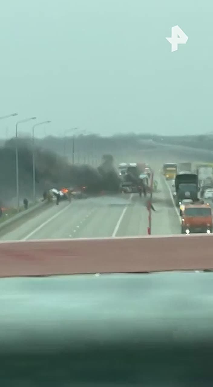 На кадрах видны огромные столбы черного дыма. Дорога перекрыта. Горят несколько машин, люди лежат на земле.