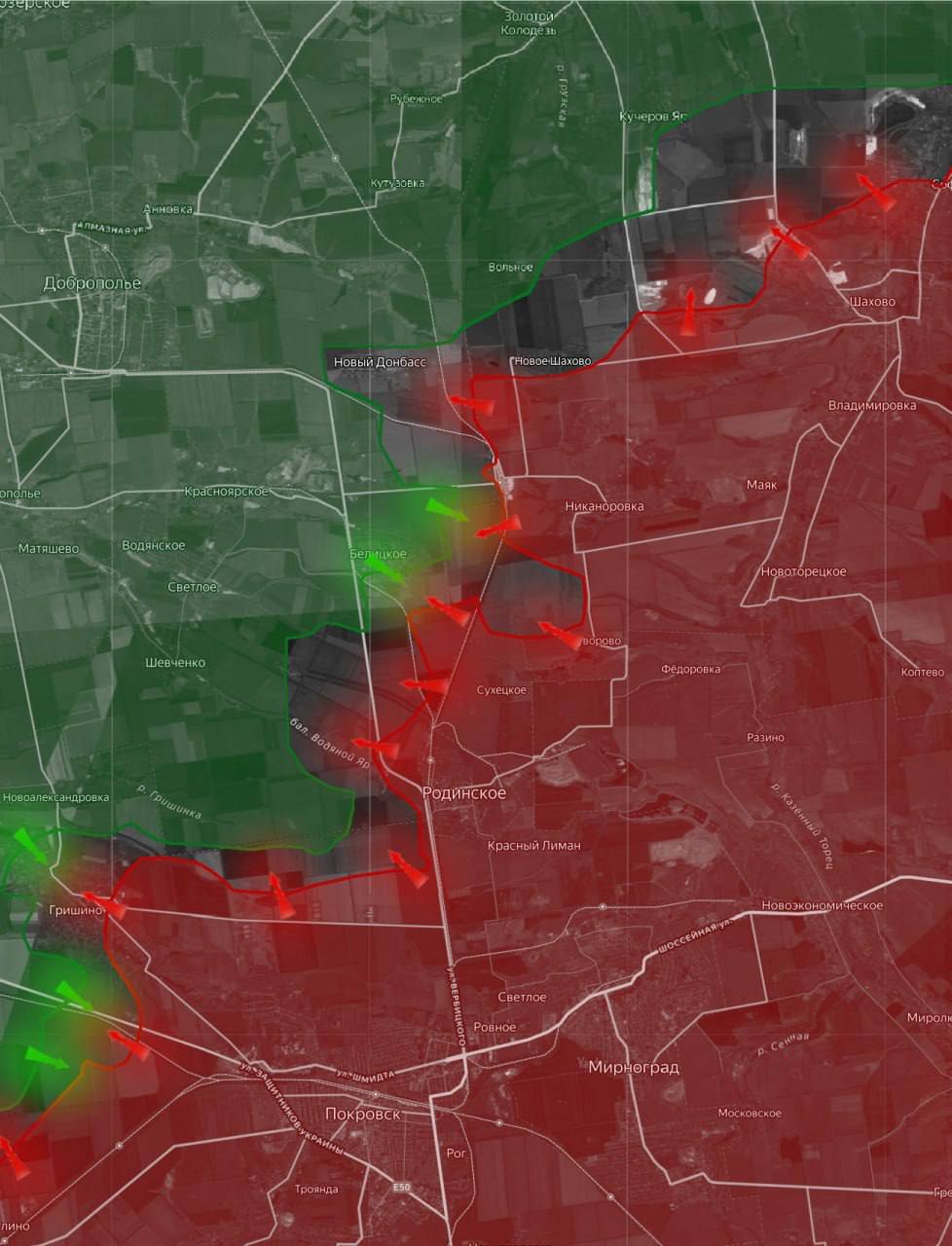 «На Покровском направлении российские подразделения продвигаются в центре Гришино. Пехотные группы действуют на обоих берегах реки Гришинка, стремясь оттеснить ВСУ к северо-западным окраинам населённого пункта.