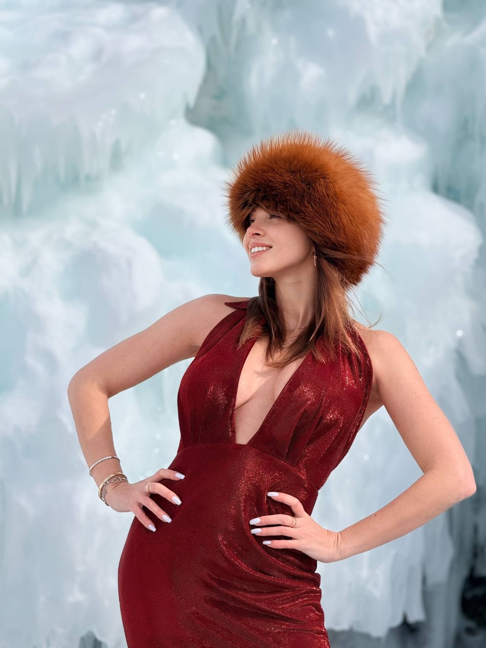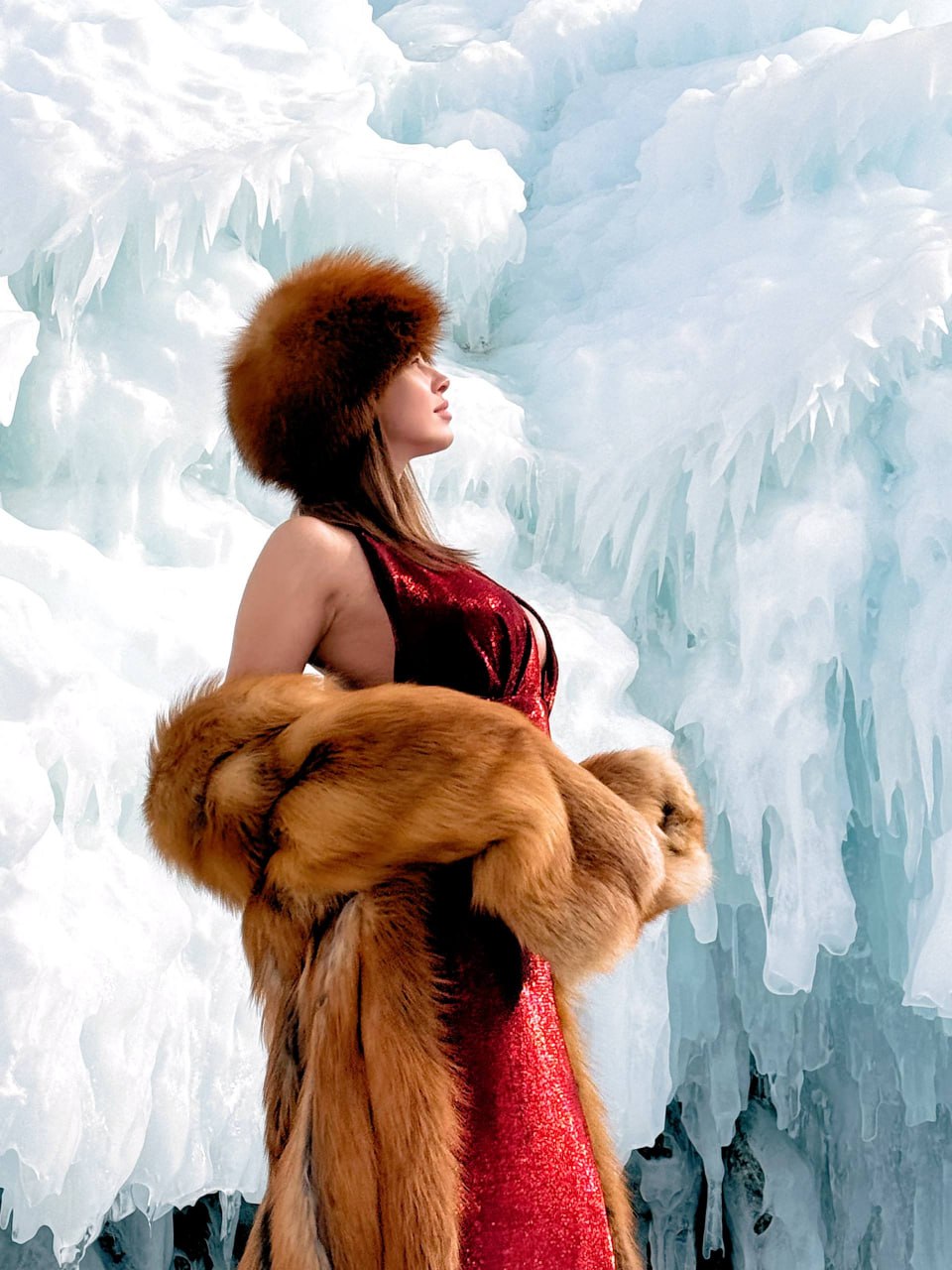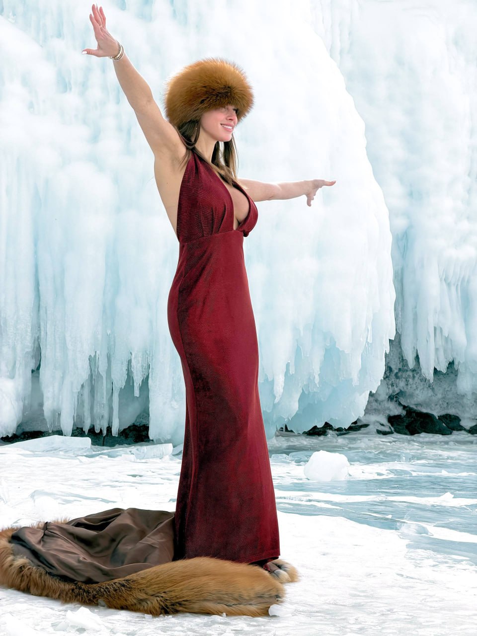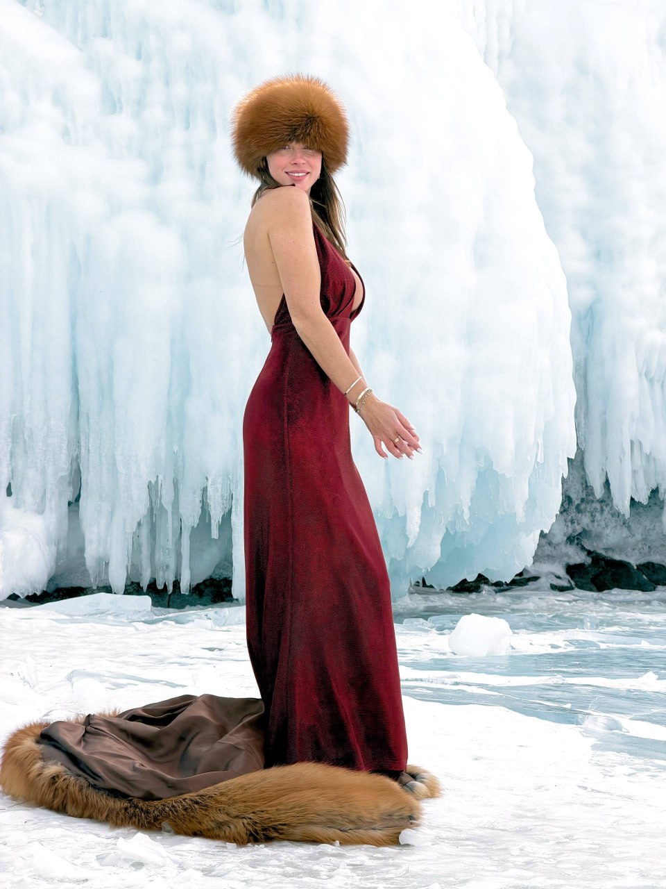 Ростовчанка Полина Диброва опубликовала серию снимков с Байкала, где предстала в довольно откровенном образе на фоне ледяных пейзажей. Для съемки она выбрала бордовое платье с экстремально глубоким декольте, подчеркнувшим фигуру, и меховую шапку, добавившую образу контраст.