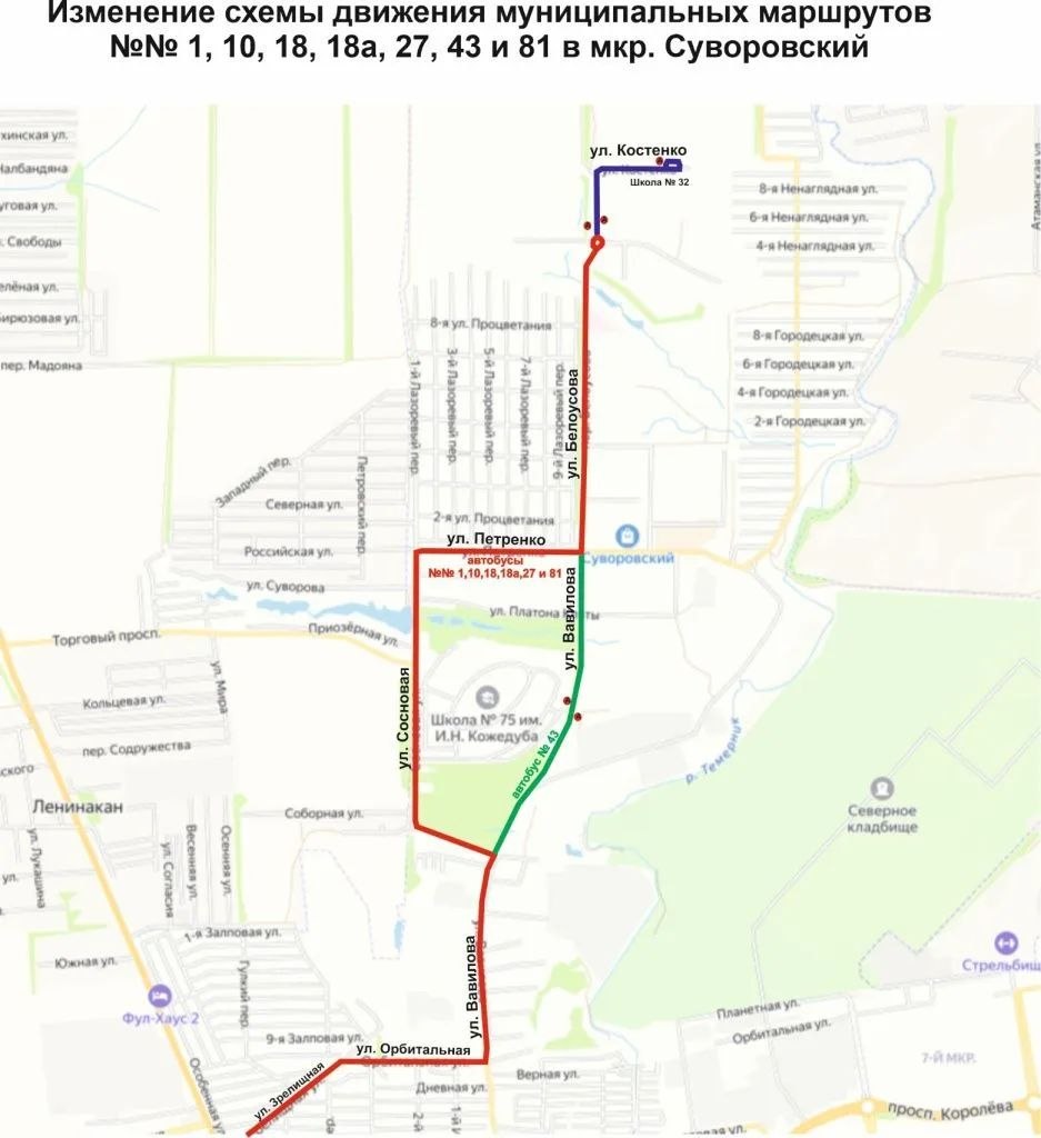 Завтра автобусы в ростовском мкр. «Суворовский» поедут по новой схеме движения. Речь идет о маршрутах №№ 1, 10, 18, 18а, 27, 43 и 81 (до Школы № 32), а также о маршруте № 43 (по ул. Вавилова от ул. Сосновая до ул. Петренко).