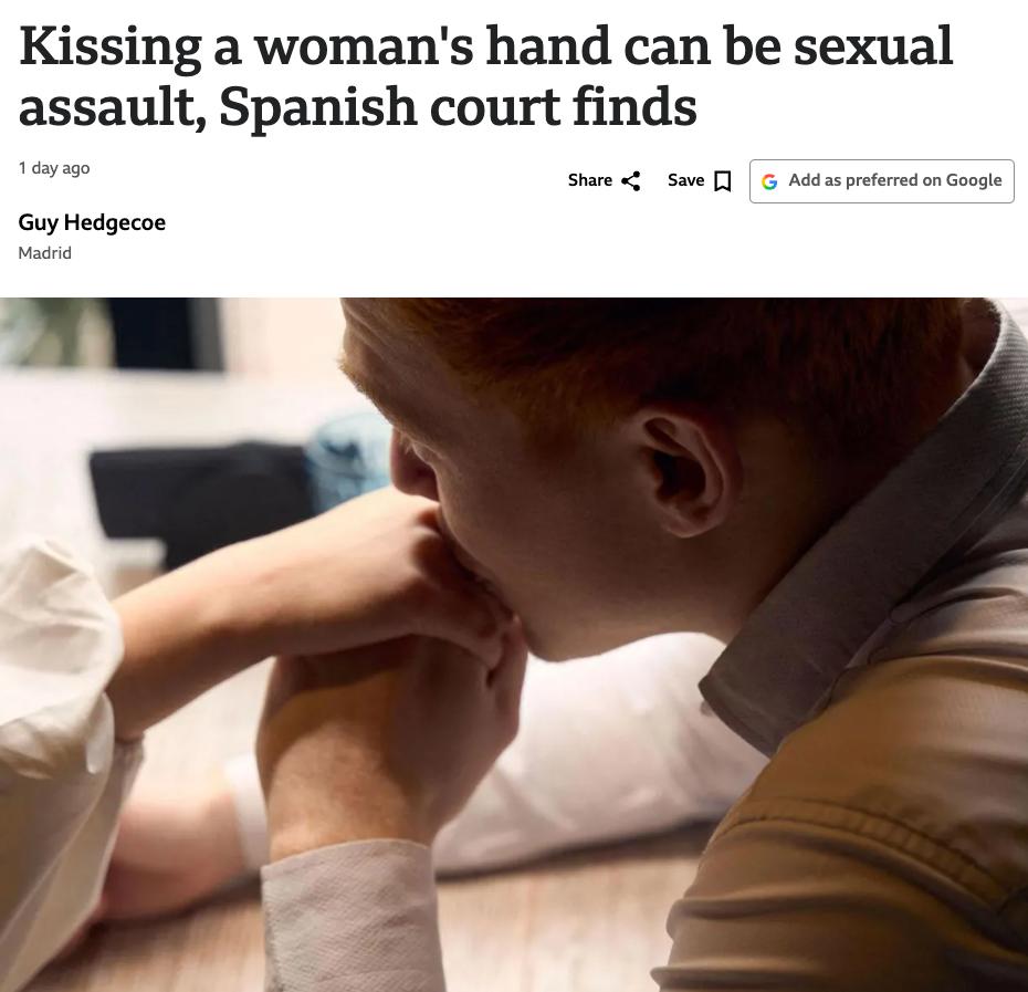 В Мадриде мужчина поцеловал руку незнакомой женщины на остановке и пригласил её вместе поехать. Суд оштрафовал его на $1620 за сексуальное насилие. Верховный суд подтвердил: «сексуальный подтекст очевиден, согласия нет».