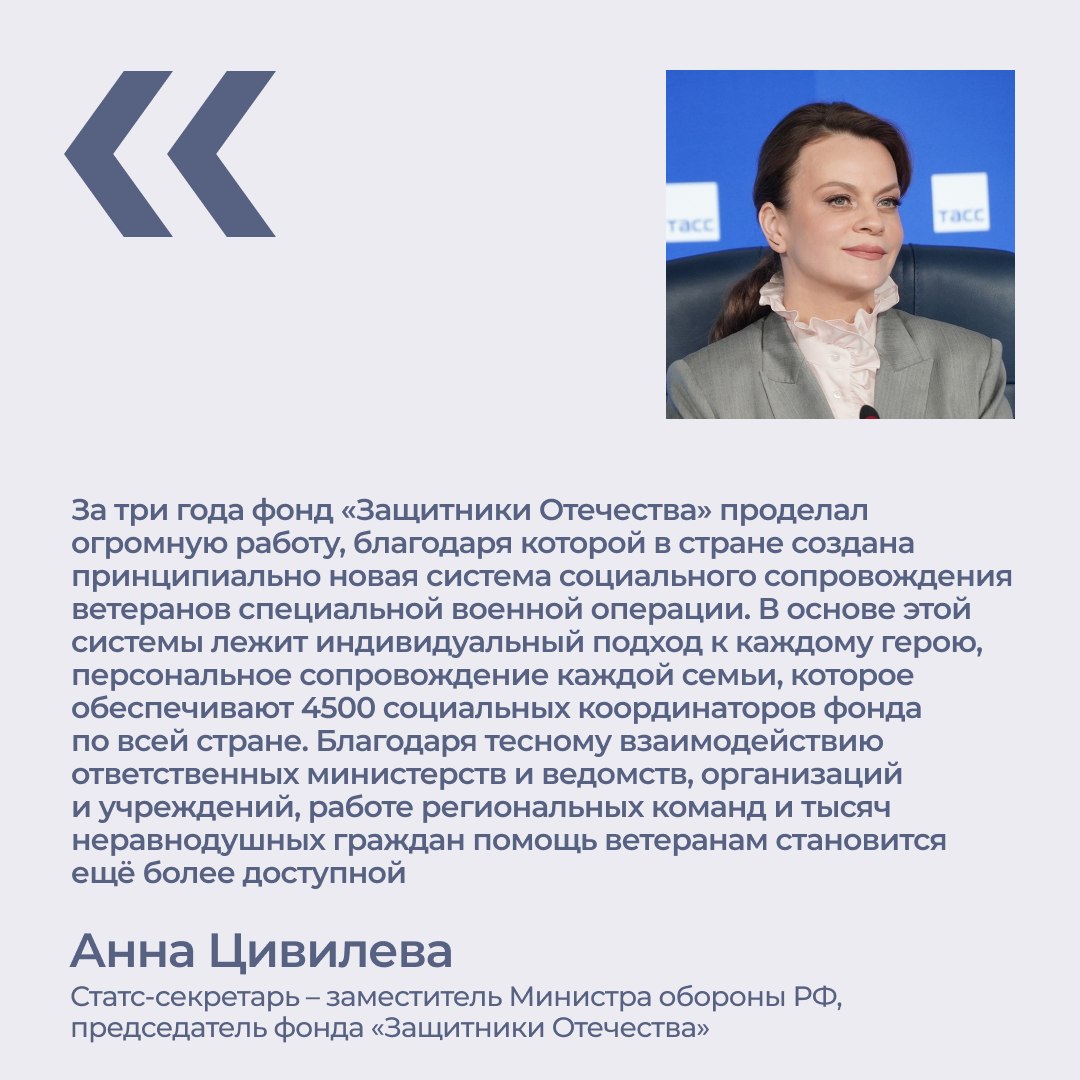 На пресс-конференции, посвященной итогам деятельности Госфонда, статс-секретарь – замминистра обороны, председатель фонда «Защитники Отечества» Анна Цивилева подчеркнула, что решение Президента об учреждении фонда стало историческим. И сегодня в адрес фонда поступило уже более 2 660 000 запросов, большинство из которых решено положительно.