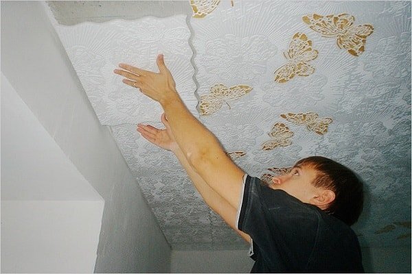 Для самого процесса наклейки подойдёт любой клей, который вам известен. Рекомендуется перед работой оставить плитку несколько часов без защитной пленки для адаптации к температуре помещения. Первую плитку следует расположить точно по центру, наклеивая её на заранее намеченные линии. Последующие плитки укладываются вплотную друг к другу. Если потребуется обрезать плитку, стоит сначала примерить её на потолке.