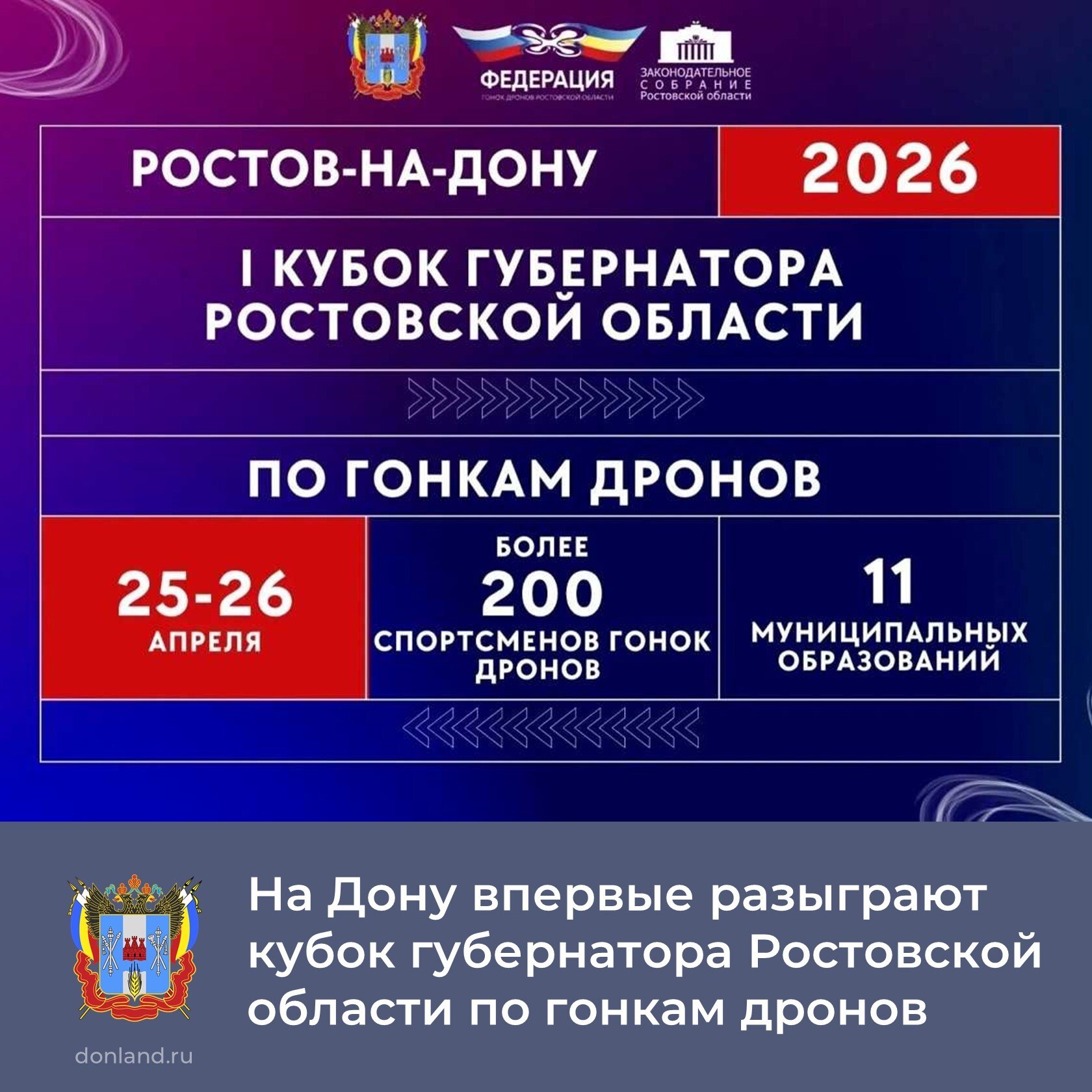 25–26 апреля в Ростове впервые пройдут соревнования «Кубок губернатора Ростовской области по гонкам дронов». В них примут участие более 180 пилотов из 11 городов и районов региона. Соревнования пройдут в манеже областного училища олимпийского резерва.