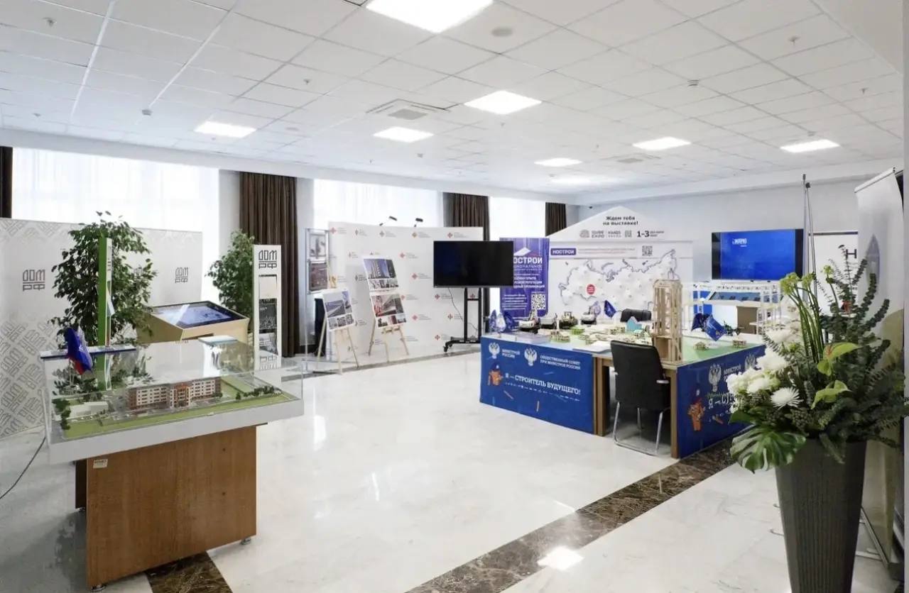Экспозиция в здании Минстроя России в рамках Совместного заседания Коллегии Министерства и Комиссии Госсовета РФ по направлению «Инфраструктура для жизни» демонстрирует передовые решения научно-исследовательских, образовательных и отраслевых организаций