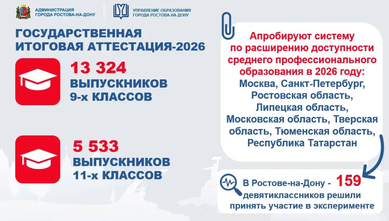 С этого года произошли изменения в процедуре ГИА для выпускников 9-х классов. Ростовская область вошла в состав 8 территорий, которые апробируют систему по расширению доступности среднего профессионального образования в 2026 году. Так, 159 выпускников 9-х классов, которые приняли решение участвовать в эксперименте, смогут поступить в колледжи по направлениям: машиностроение, металлообработка, радиоэлектроника, сельское хозяйство здравоохранение, образование. Сдать им необходимо будет только два экзамена - по русскому языку и математике. Стать участниками эксперимента можно до 23 июня, для этого необходимо написать заявление в своей образовательной организации.